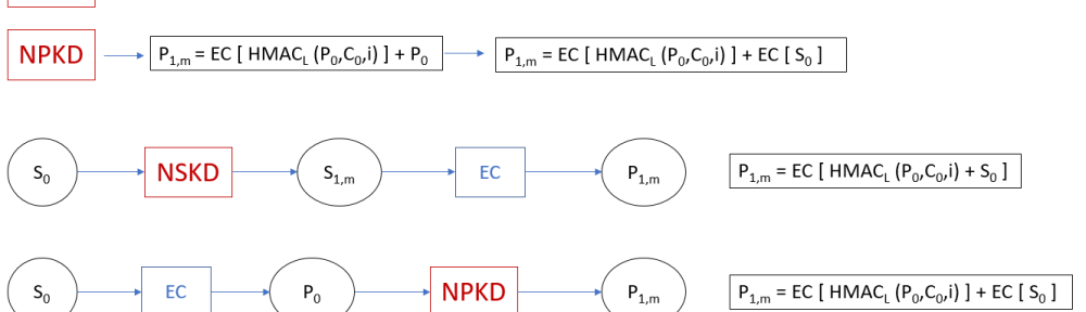 And in formulae, NSKD would be first calculating HMAC-512 of P0, C0 and i, taking the left part and adding it modulo N to S0, to obtain S1,m.